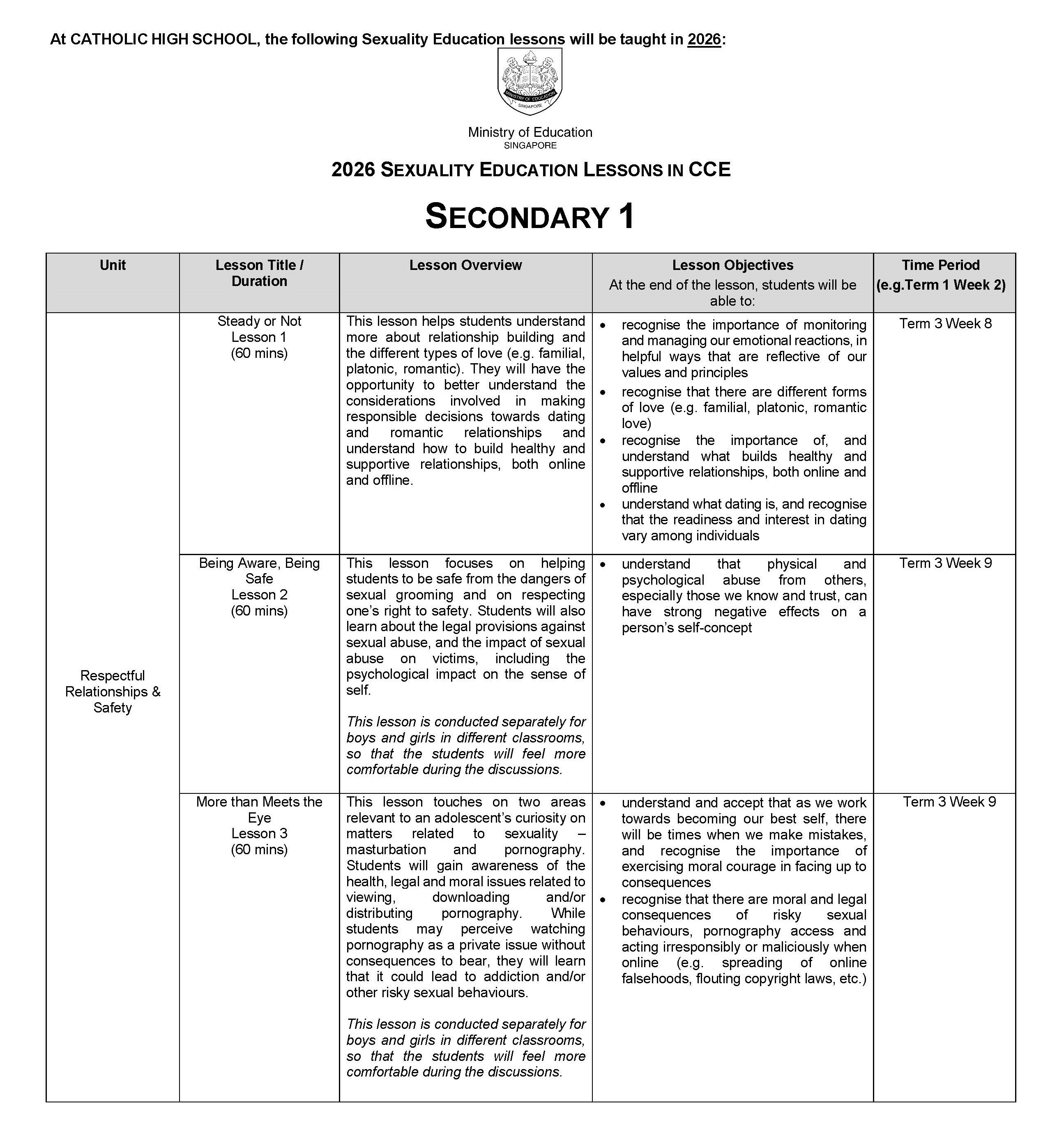 Overview of CATHOLIC HIGH SCHOOL’s Sexuality Education Programme for 2026
